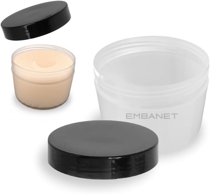 Fabricado em PP (Polipropileno), o pote tem dimensões de 8,6 cm de diâmetro e 6 cm de altura, pesando 300 gramas. Seu design transparente liso oferece ótima visualização do conteúdo, enquanto a tampa preta rosqueável assegura proteção contra vazamentos e contaminações.