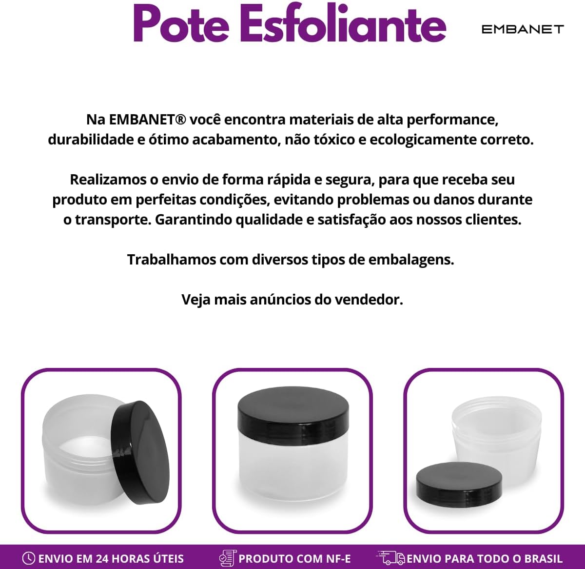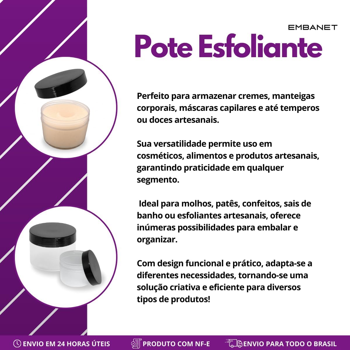 Direcionado a profissionais de beleza, produtores artesanais e consumidores que buscam embalagens funcionais e versáteis, o pote esfoliante 300ml atende quem precisa de praticidade e qualidade para armazenar cosméticos ou alimentos com segurança.