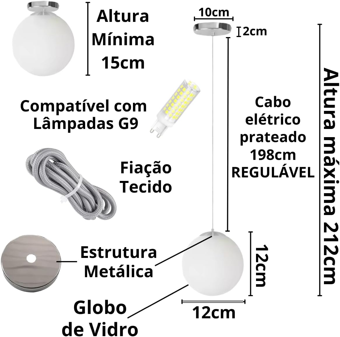 A luminária mede 12cm de largura e profundidade, com altura ajustável entre 15cm e 212cm. A base de teto em metal tem 10cm de diâmetro e 2cm de profundidade, na mesma coloração da peça. O globo de vidro fosco possui abertura inferior de 6,5cm, e o cabo elétrico de 2 metros é revestido com cor uniforme ao corpo da luminária.