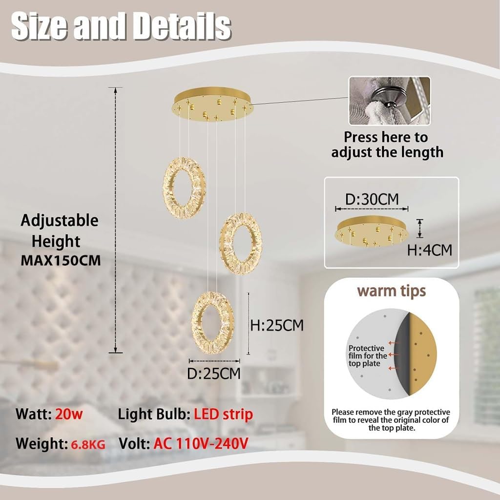 Este lustre apresenta potência de 20W, adequado para iluminar áreas entre 10 a 15 m², e opera em voltagem de 110V a 240V, compatível com diversas instalações. Possui grau de proteção IP20, ideal para ambientes internos. O design conta com acabamento em dourado ou prateado, valorizando qualquer decoração moderna.