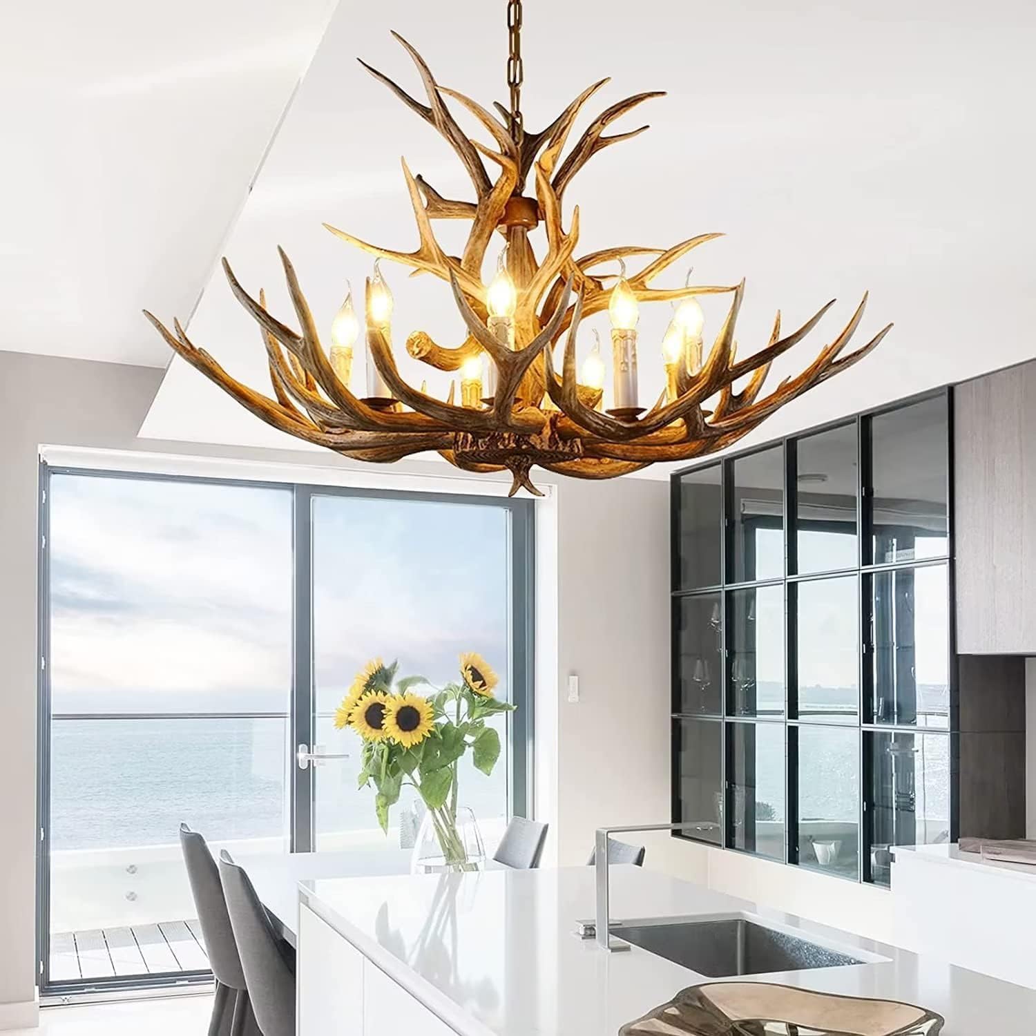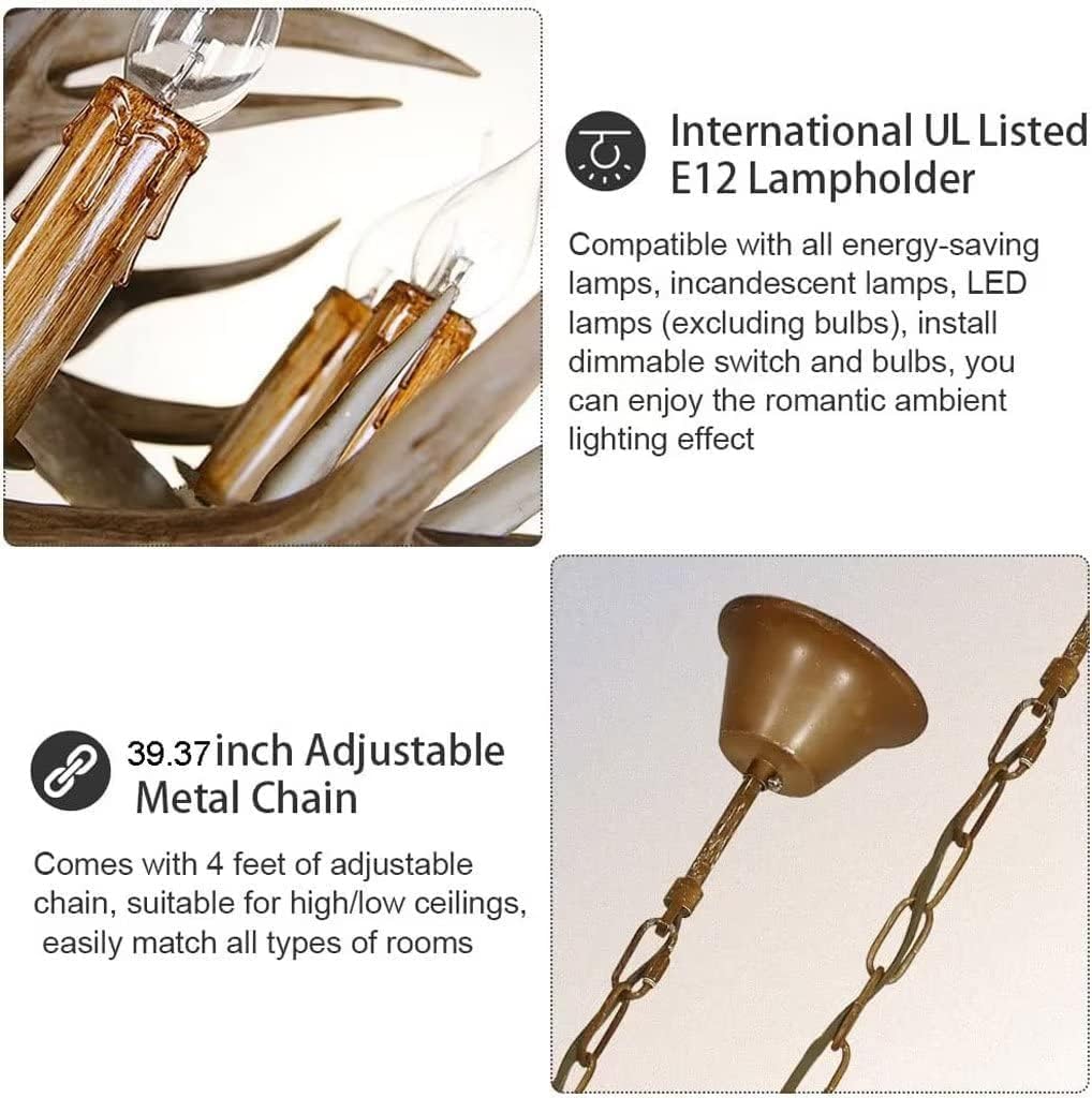 O lustre conta com 8 soquetes E12 para lâmpadas LED ou de economia de energia, proporcionando uma iluminação brilhante e econômica. Seu design em chifres realistas cria uma fusão entre o moderno e o retrô, valorizando qualquer decoração com um toque natural e artístico. Além disso, a corrente ajustável de 100 cm permite fácil adaptação a diferentes alturas de teto.