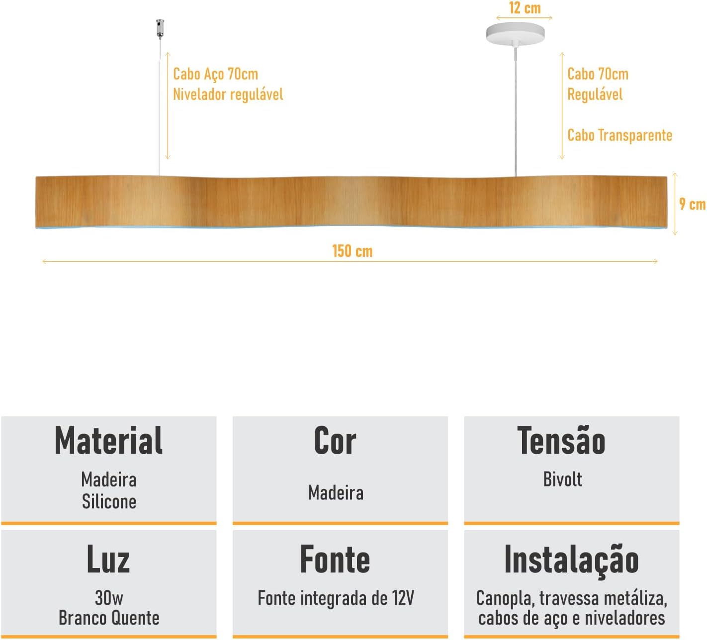 A luminária pesa 3,4 quilogramas e vem em embalagem com dimensões de 155 x 21 x 18 centímetros, facilitando o transporte e armazenamento. O produto utiliza luz LED direcionada, ideal para iluminação eficiente e duradoura. A estrutura em madeira oferece robustez e beleza natural, complementando diferentes estilos de decoração.