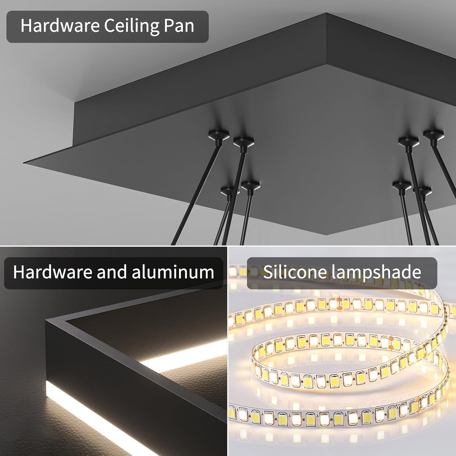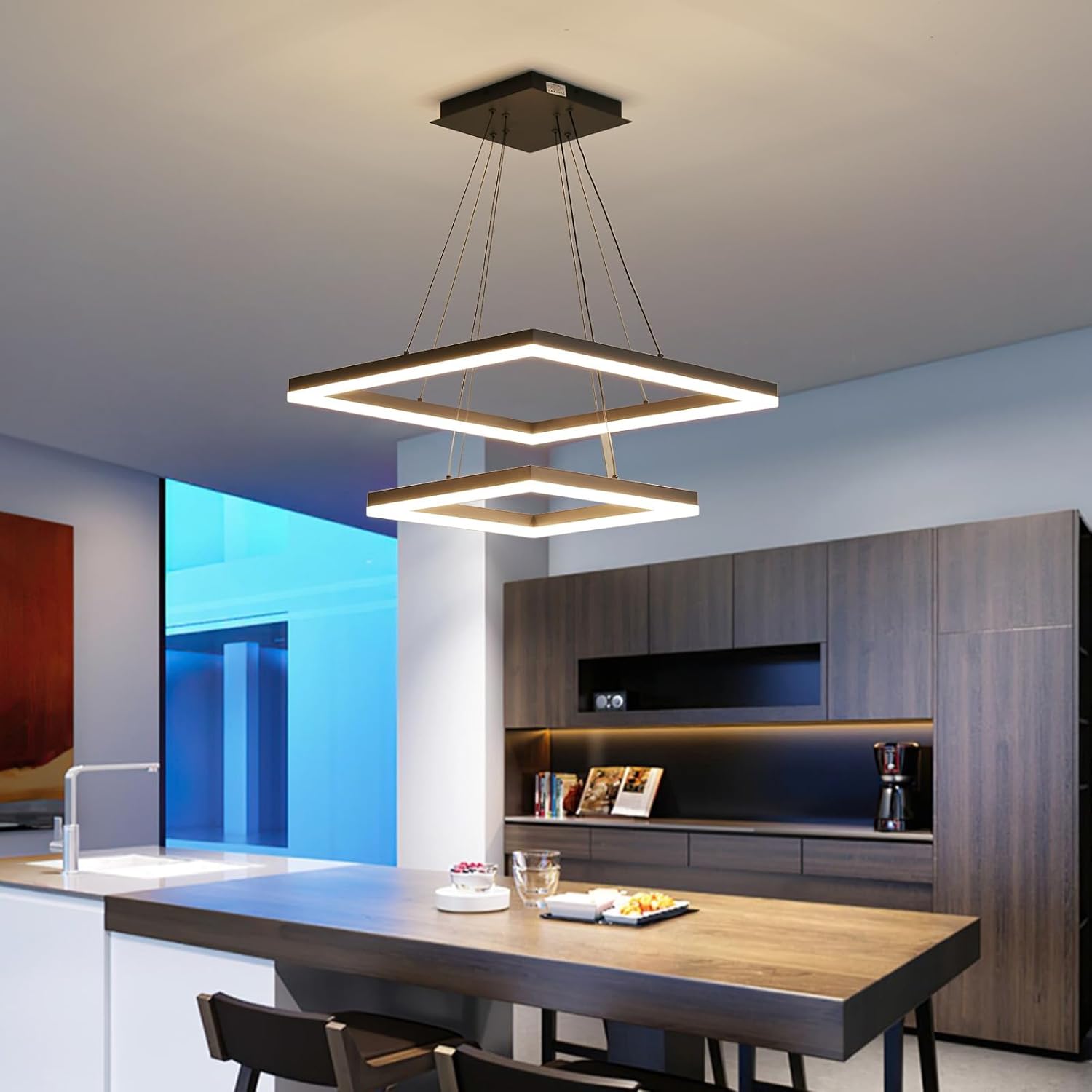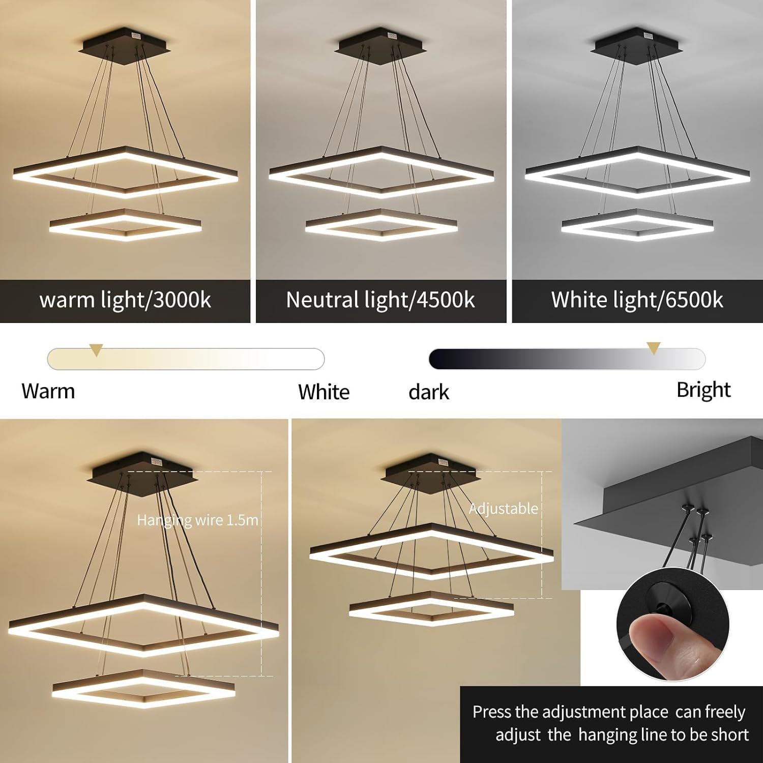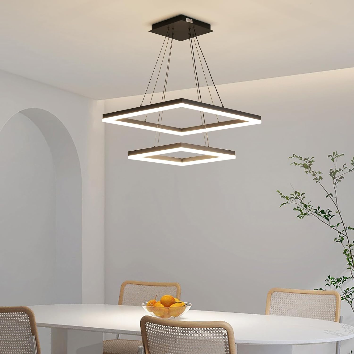 O lustre moderno da marca Mikeru oferece uma iluminação eficiente e versátil para ambientes internos. Com design em formato E-quadrado e acabamento preto, ele combina alumínio resistente com uma cúpula de silicone branca, garantindo sofisticação e durabilidade. Este modelo é ideal para quem busca luz LED com temperatura de cor ajustável, proporcionando conforto visual e economia de energia.