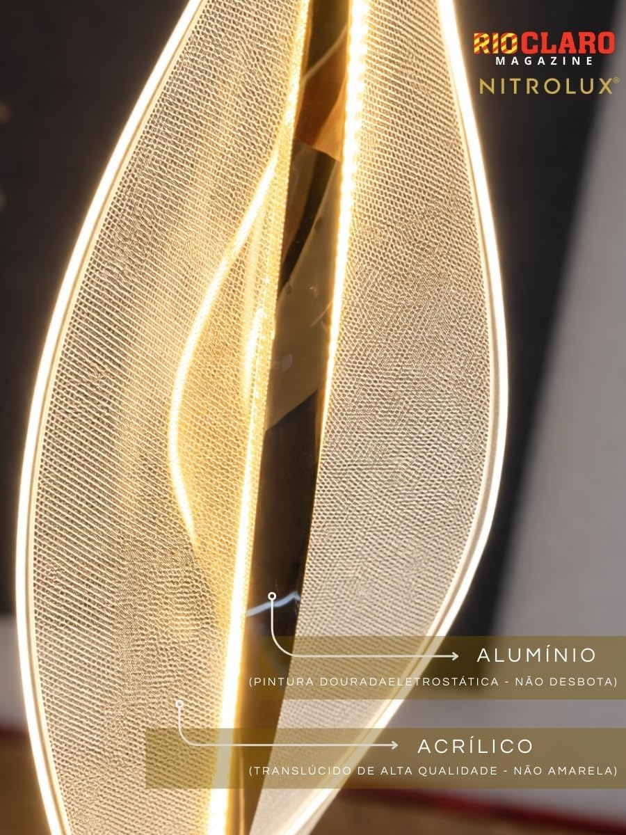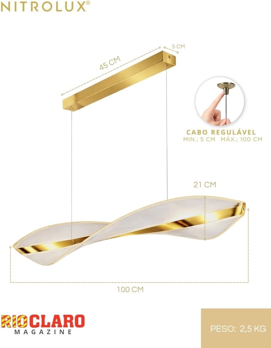 O lustre Nitrolux modelo 6214 mede 105 cm de altura, 27 cm de comprimento e 20 cm de largura. Seu corpo é fabricado em acrílico e alumínio, garantindo durabilidade e acabamento premium no tom rose gold. A potência é de 25W com fluxo luminoso de 1750 lúmens, adequado para iluminar com qualidade ambientes internos.