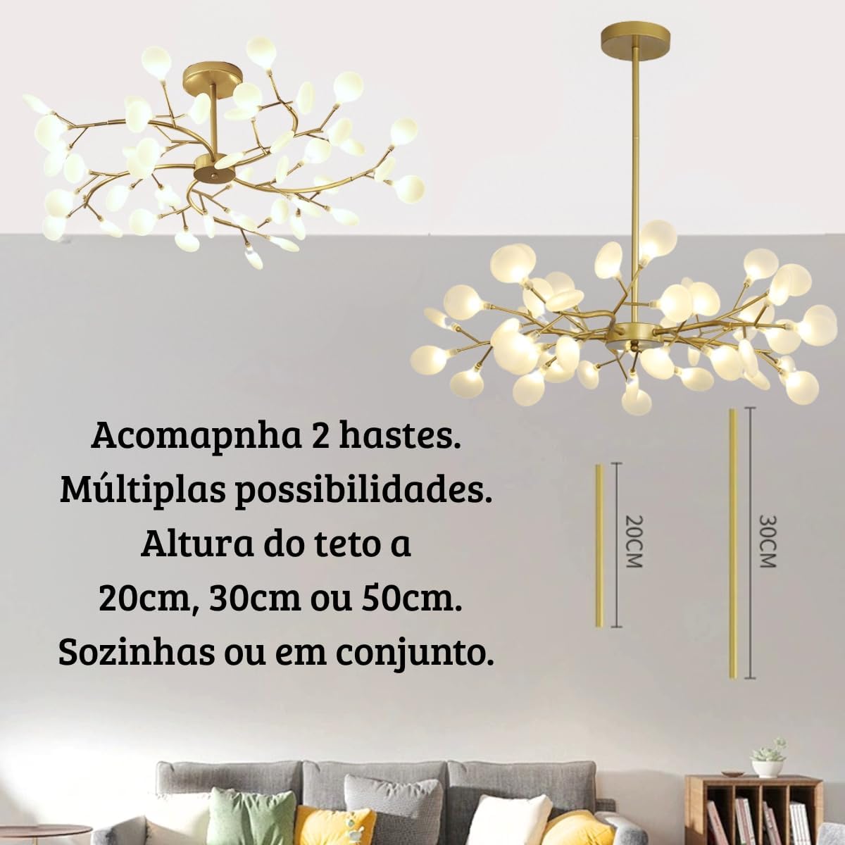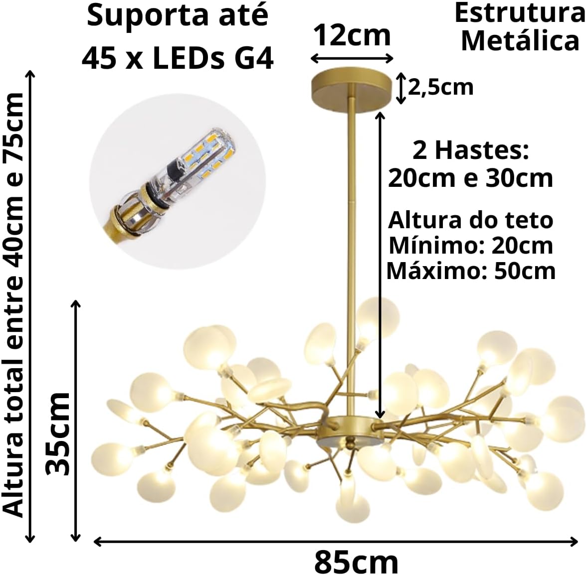 Cada ramo mede 40 cm e suporta lâmpadas G4 de até 20 watts (não inclusas). O cabo elétrico e a fiação já vêm instalados para facilitar a montagem no teto. As medidas da embalagem são 30 x 30 x 30 cm, garantindo um transporte seguro.