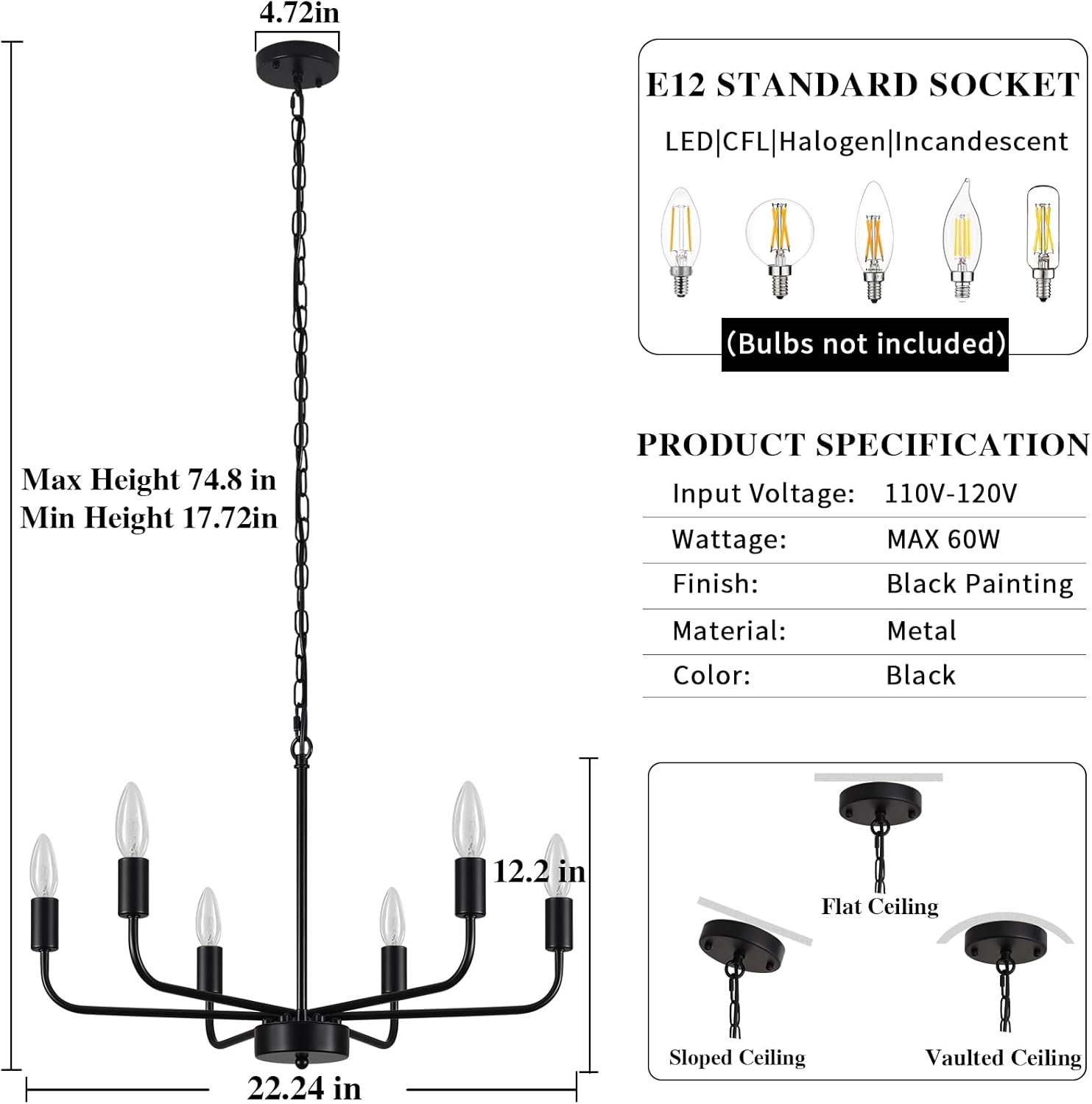 Seu sistema de montagem semi-embutida facilita a instalação em tetos altos, e o acabamento em metal antiferrugem garante resistência e durabilidade. Com capacidade para seis lâmpadas E12, o lustre suporta lâmpadas incandescentes, LED, halógenas e CFL, oferecendo flexibilidade para diferentes estilos de iluminação.