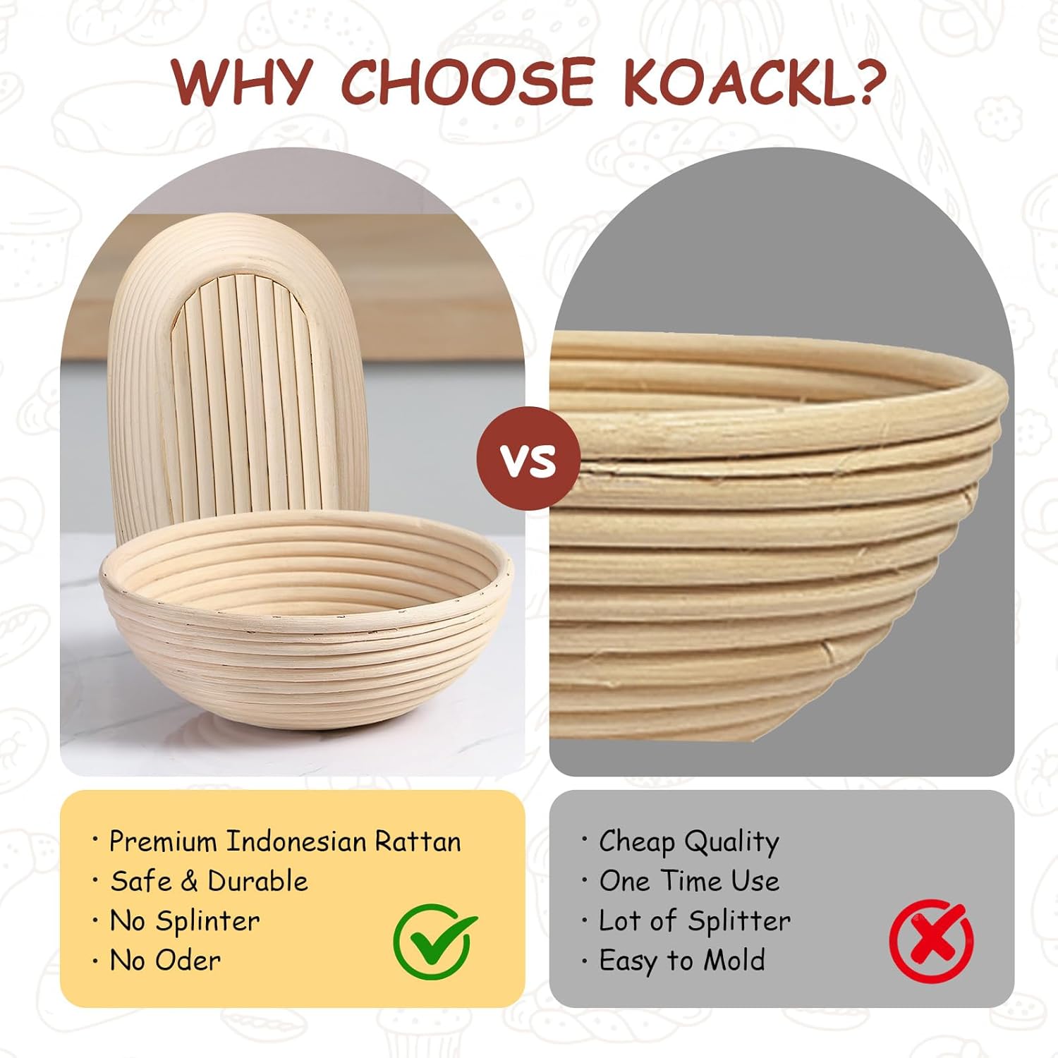 Descubra o kit de cesta à prova de pão da marca Koackl, ideal para quem busca ferramentas profissionais para fazer pão caseiro com qualidade. Este conjunto inclui cestas redonda e oval em rattan natural, perfeitas para massa fermentada, garantindo um formato uniforme e crocância na casca do pão. Perfeito para iniciantes e padeiros experientes, este kit de pão fermentado combina praticidade e durabilidade para facilitar suas receitas.
