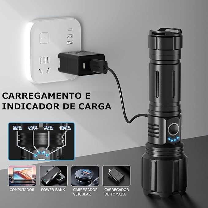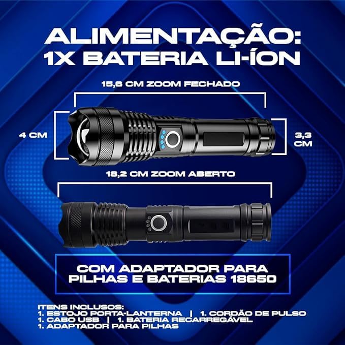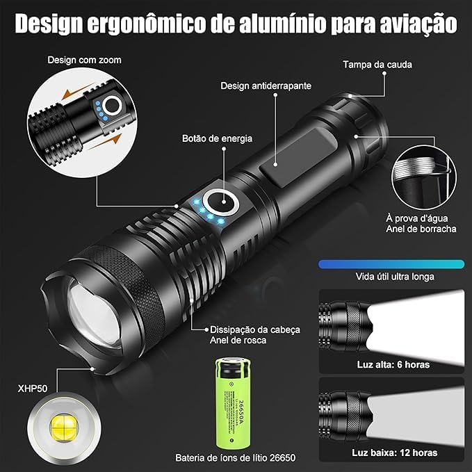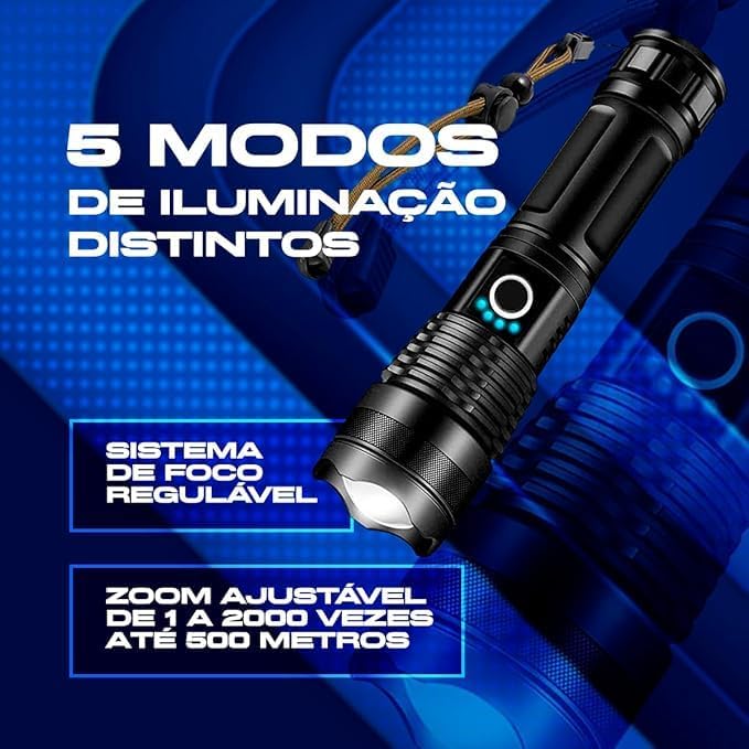 O grande diferencial deste modelo é o seu sofisticado sistema de zoom de longo alcance, que permite adaptar o foco da iluminação conforme a necessidade. Com essa lanterna LED de alta potência, você consegue alternar rapidamente entre a iluminação de áreas amplas para acampamentos ou o foco direcionado para inspecções precisas à distância.