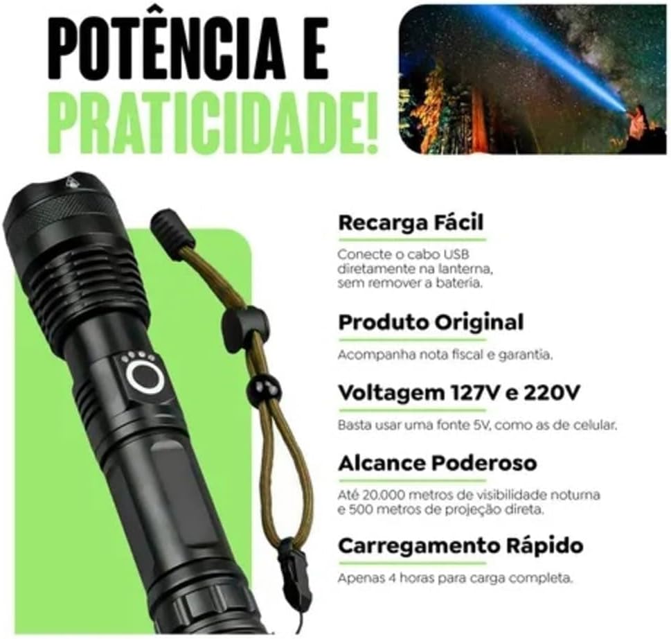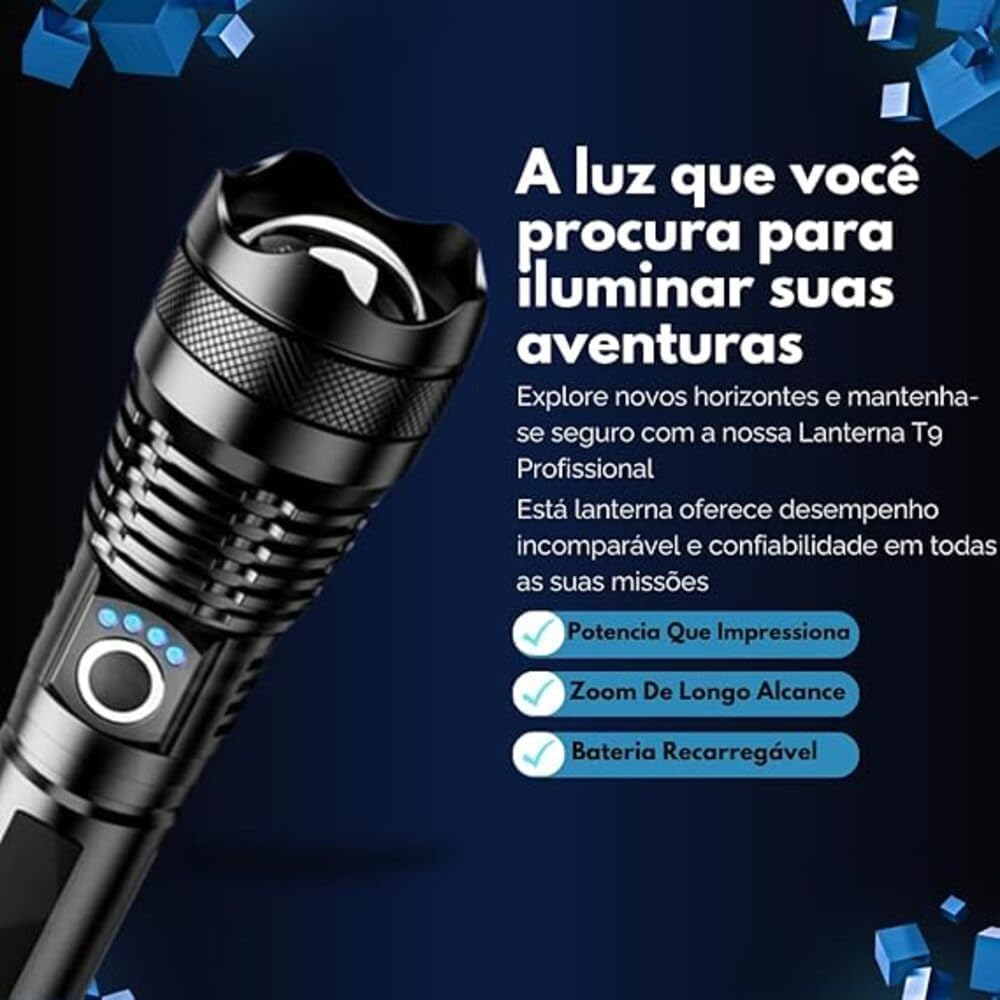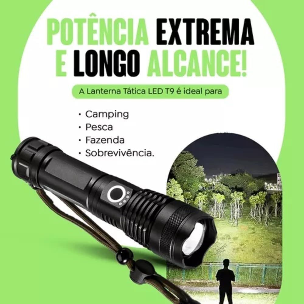 A lanterna tática recarregável T9 LED P50 oferece a potência profissional necessária para iluminar qualquer ambiente com eficiência e total confiabilidade. Com um design moderno em aço inoxidável e alto desempenho técnico, este equipamento é a escolha ideal para quem busca uma ferramenta versátil e durável para o dia a dia, trabalho ou situações de emergência.