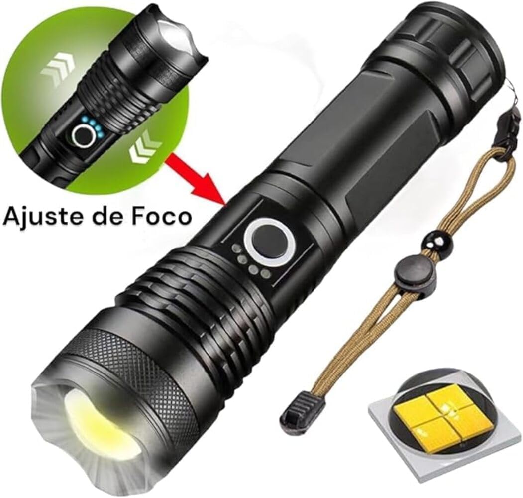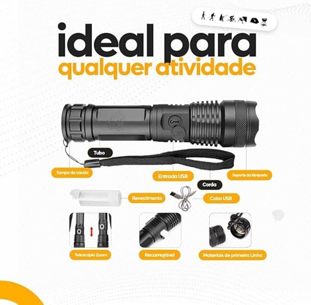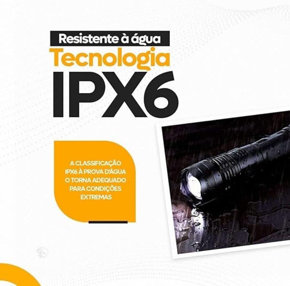 Esta lanterna tática recarregável possui uma lente com zoom ajustável, permitindo alternar entre um feixe amplo para visão periférica e um feixe concentrado para iluminação de longa distância. Essa precisão garante que você tenha a visibilidade ideal, seja em trilhas, manutenções técnicas ou inspeções noturnas.