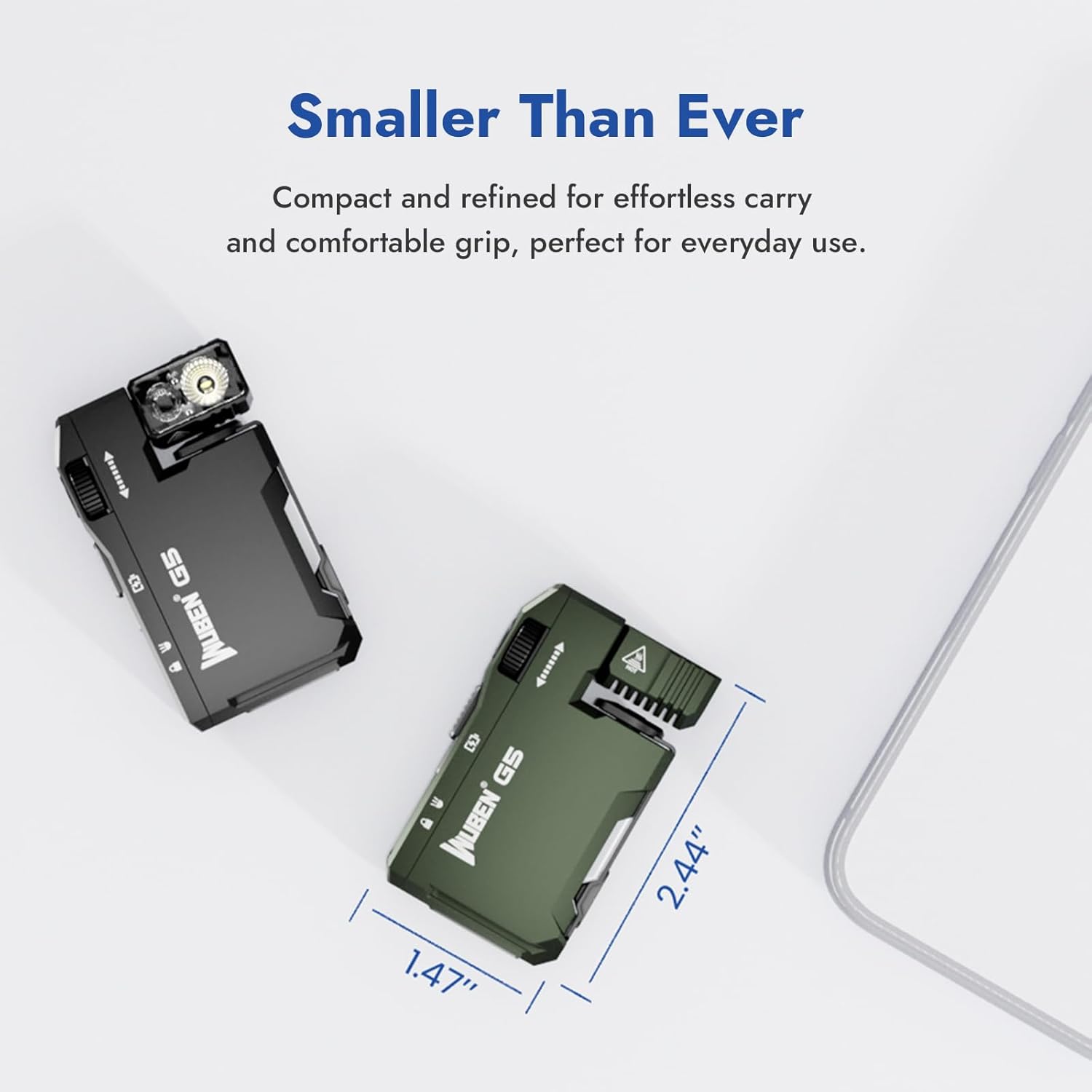 A WUBEN G5-LS possui dimensões aproximadas de 1,5 x 3,73 x 6,2 cm e um peso reduzido de apenas 54,4 gramas, facilitando o transporte diário. O corpo é fabricado em alumínio escovado de alta durabilidade, projetado para suportar o uso rigoroso em campo ou no trabalho.
