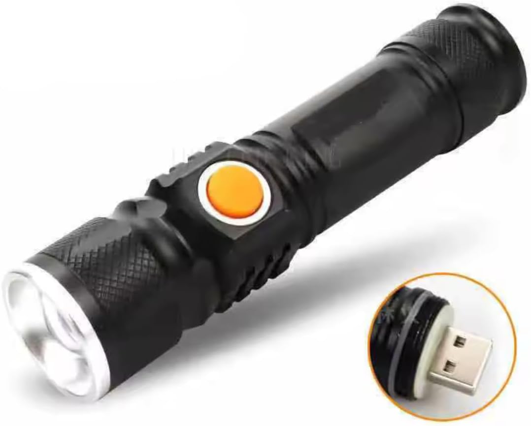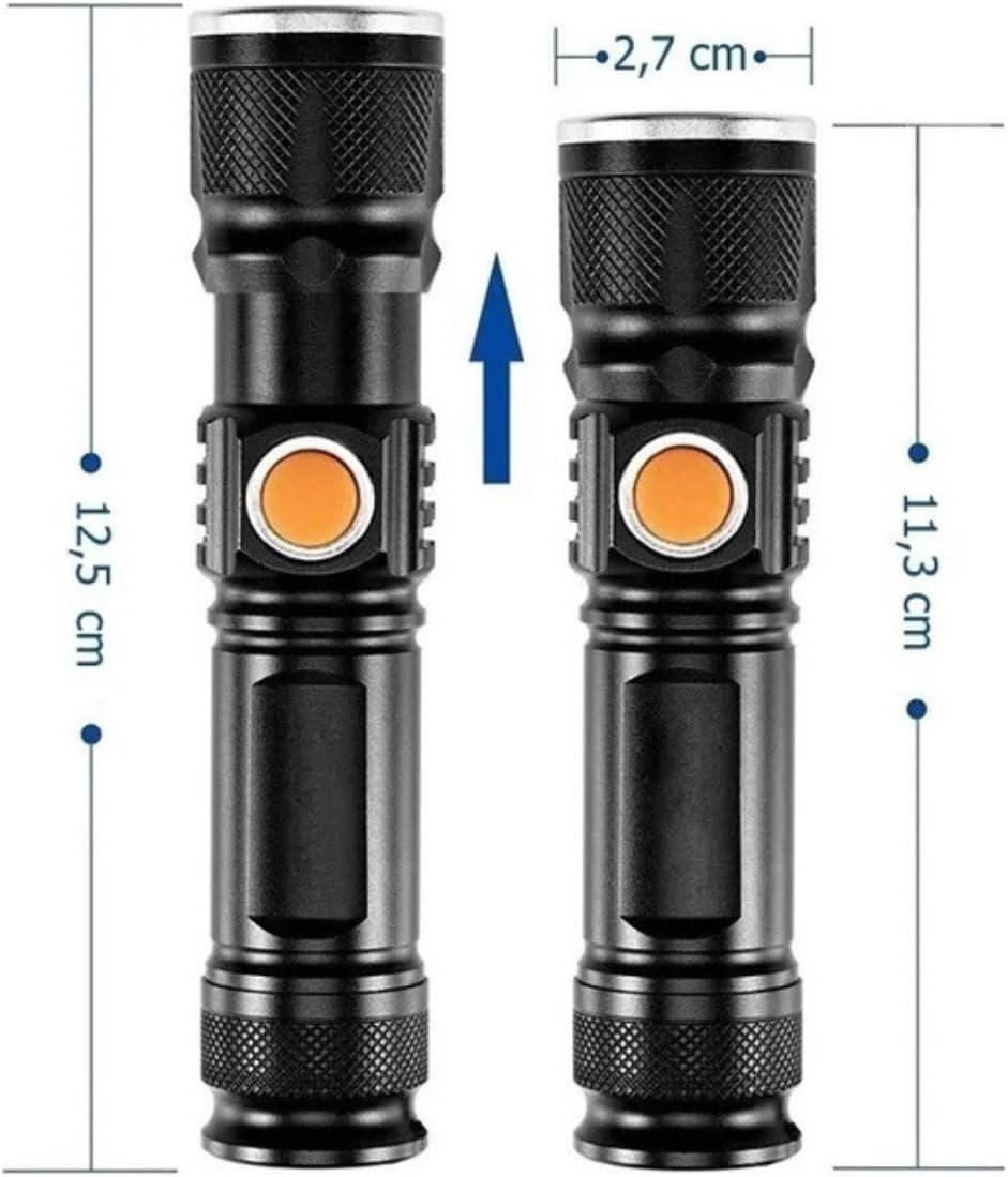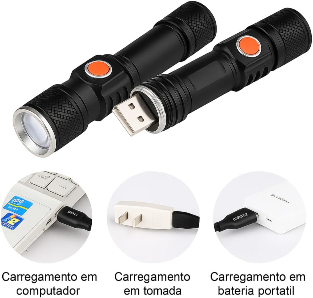 Equipada com tecnologia LED T6 de alto desempenho, esta lanterna LED recarregável proporciona um feixe de luz focado e de longo alcance. Sua versatilidade é garantida pelos três modos de iluminação disponíveis: alto, baixo e estroboscópico, permitindo ajustar a intensidade conforme a necessidade e economizar energia quando necessário.