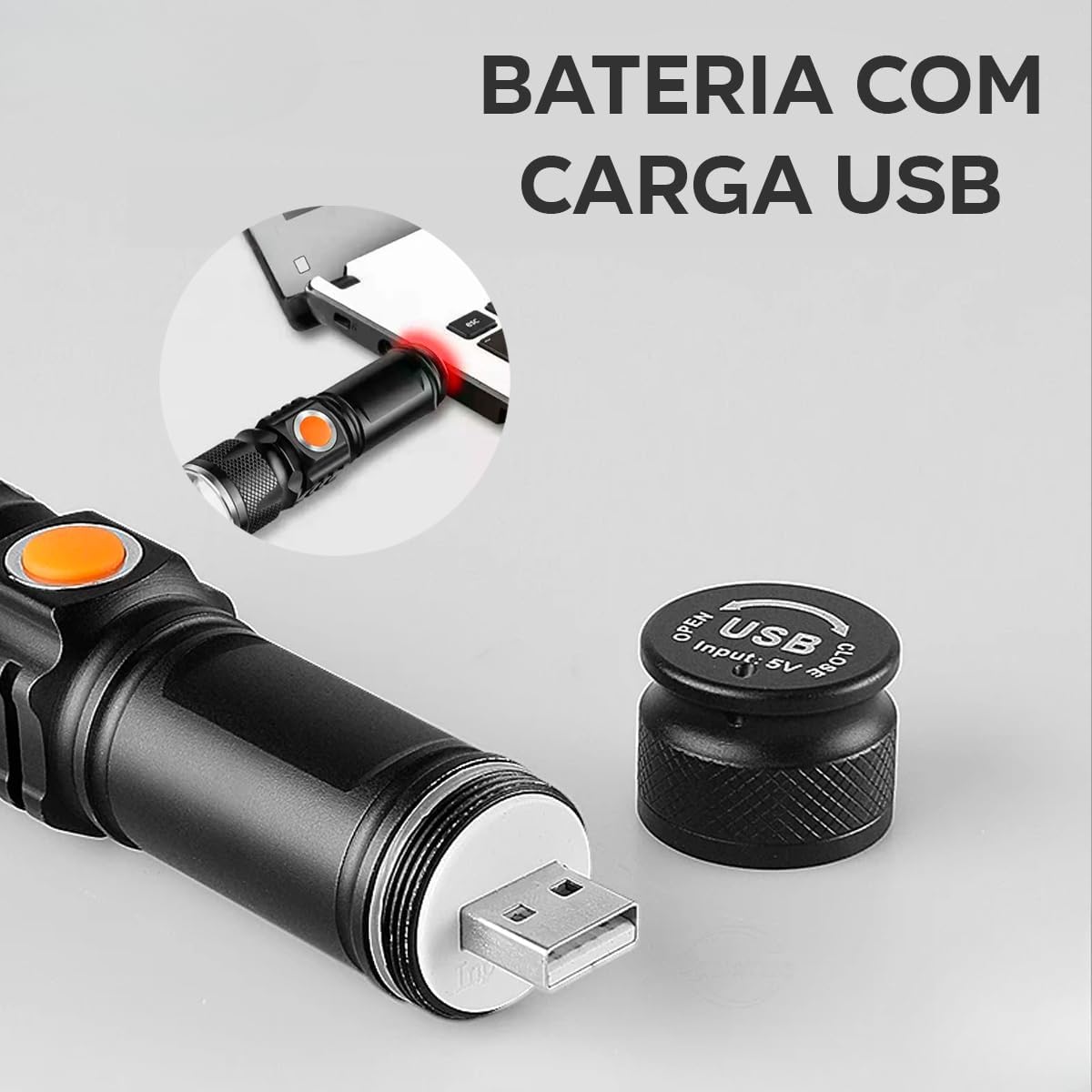 O modelo VAL-2043 possui dimensões compactas de 3 x 11 x 3 cm e pesa apenas 50 gramas, garantindo portabilidade extrema. O corpo é fabricado em alumínio reforçado na cor preta, acompanhando cabo USB para carregamento bivolt, eliminando a necessidade de pilhas convencionais.