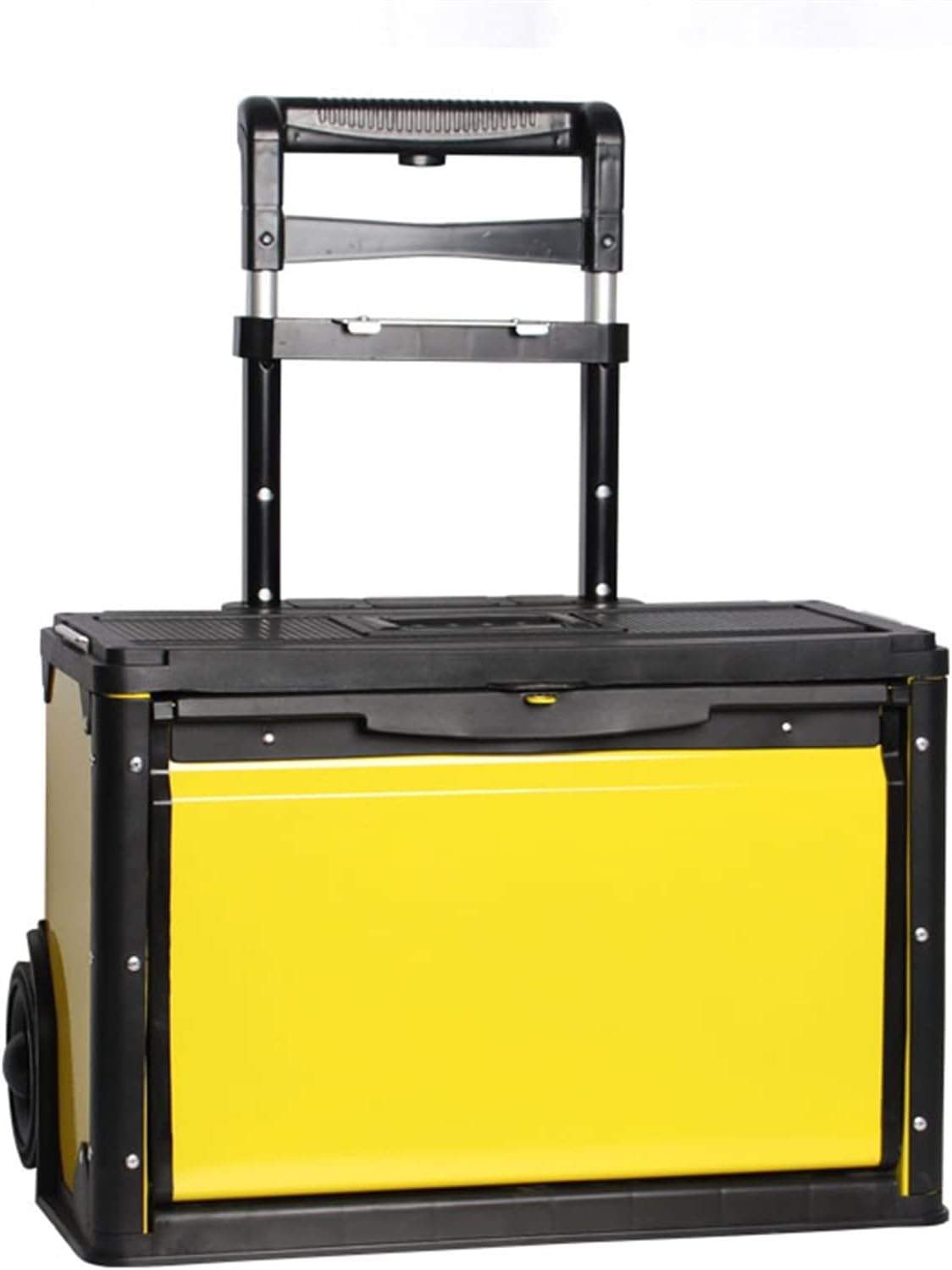 Este organizador de oficina de garagem destaca-se pela sua estrutura robusta, composta por uma combinação resistente de metal e plástico. A presença de rodinhas facilita o transporte, tornando a movimentação de ferramentas pesadas muito mais ágil e menos cansativa ao redor do seu local de trabalho.