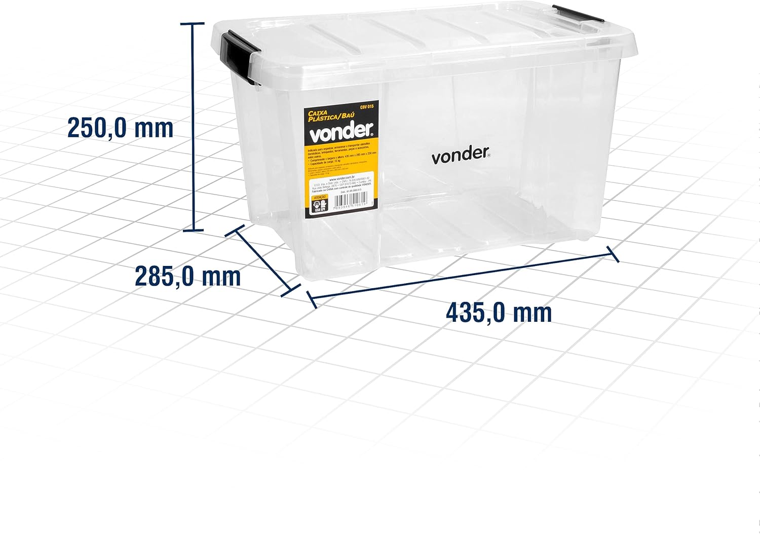 A embalagem contém uma unidade da caixa plástica Vonder. Recomendamos sempre o uso de equipamentos de proteção individual ao manusear ferramentas e materiais de construção para garantir a sua total segurança durante o trabalho.