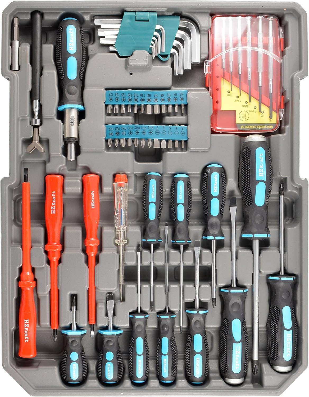 Para trabalhos elétricos, o kit dispõe de chaves voltadas para alta tensão e uma chave de teste (100 a 250 V). As extensões oferecidas variam de 3″ a 10″, incluindo opções flexíveis e em formato “T”, proporcionando alcance total independentemente da complexidade do ângulo ou da posição do parafuso.