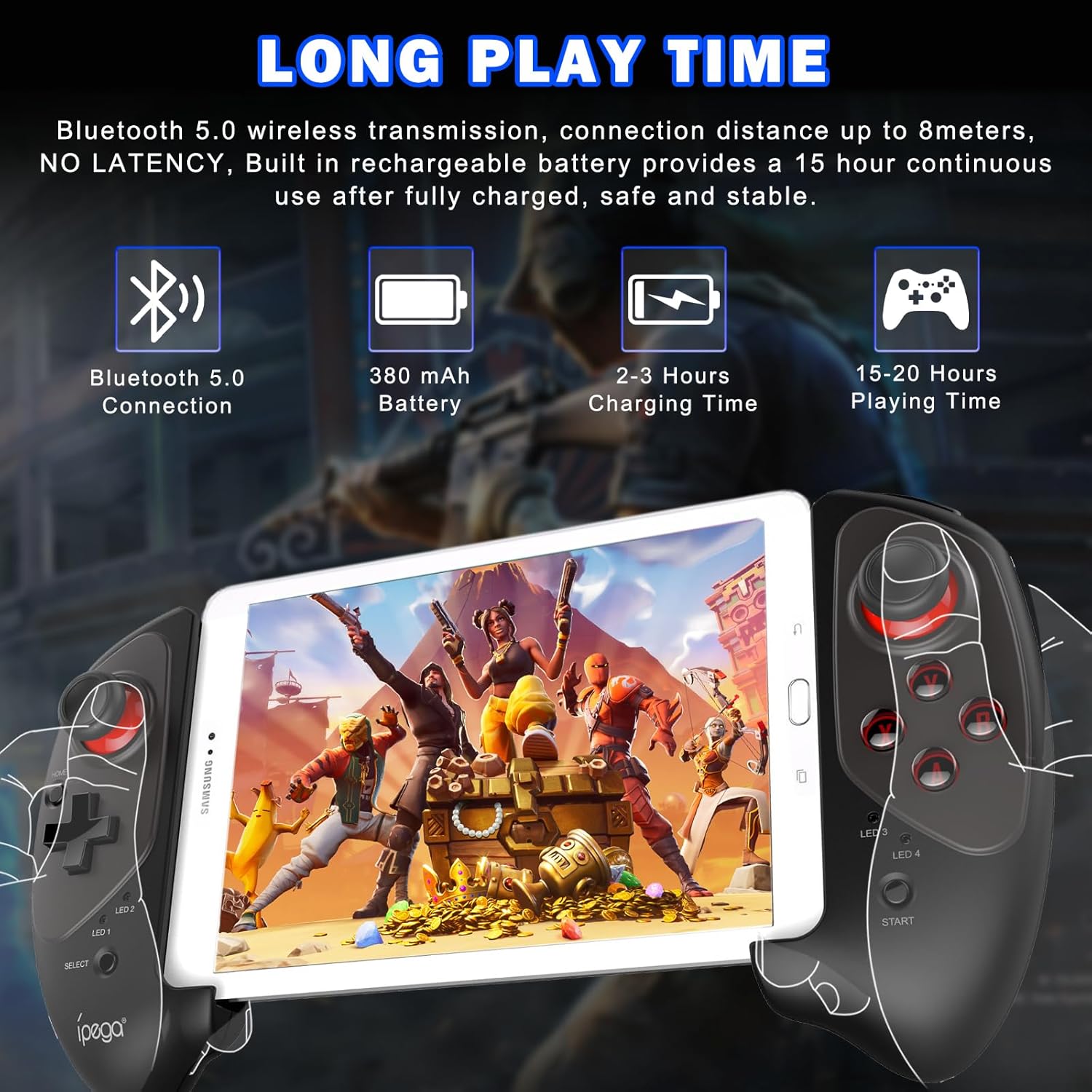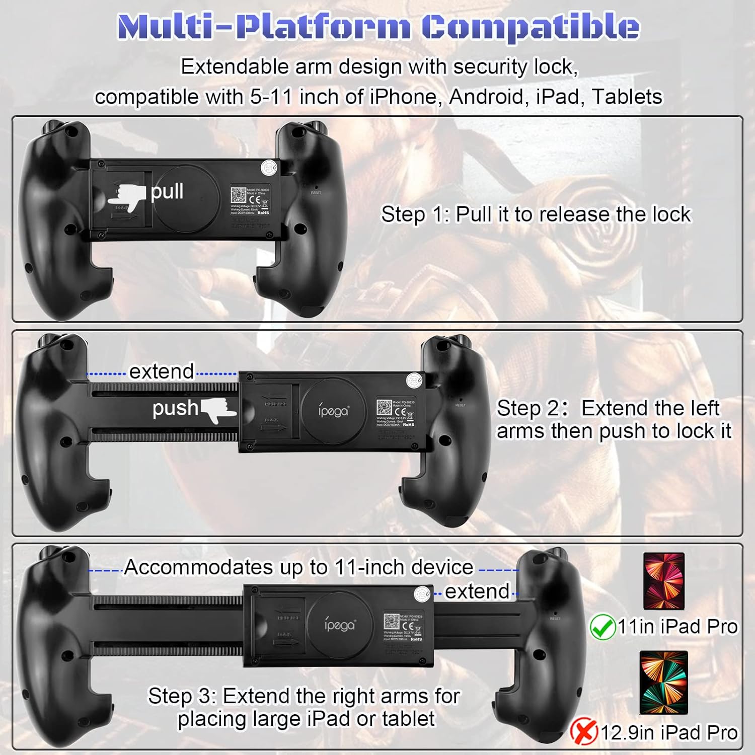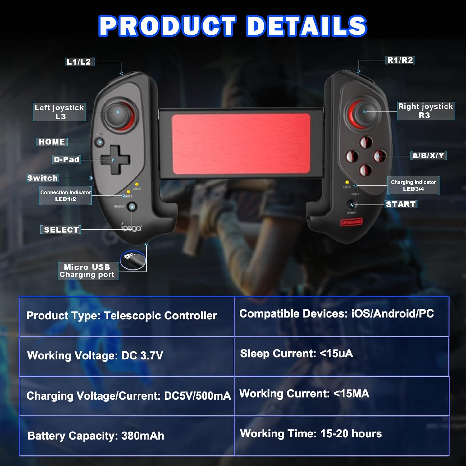 Este dispositivo possui compatibilidade com sistemas iOS 13.4+, Android 6.0+ e Win 7.0+. Sua bateria é recarregada via porta micro USB em apenas 2 horas, utilizando o cabo de 30 cm incluso. O design ergonômico inclui uma braçadeira ajustável capaz de suportar smartphones de até 11 polegadas, garantindo firmeza durante o uso.