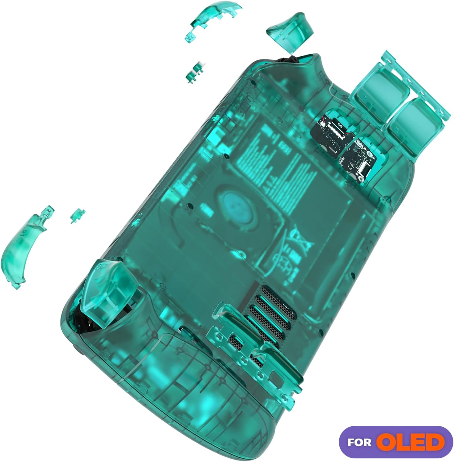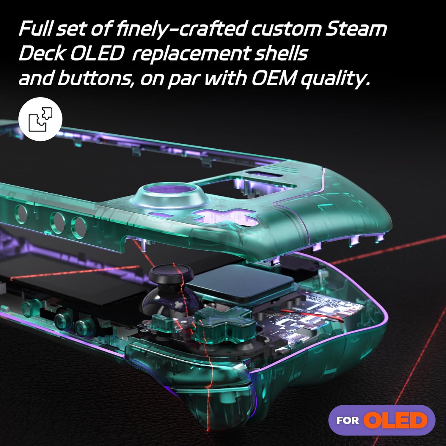 Este conjunto é compatível exclusivamente com o Steam Deck OLED, não servindo para o modelo LCD de 2022. O pacote não inclui peças eletrônicas, console ou bateria; trata-se apenas de um kit de substituição de estrutura externa que exige instalação manual e cuidadosa.