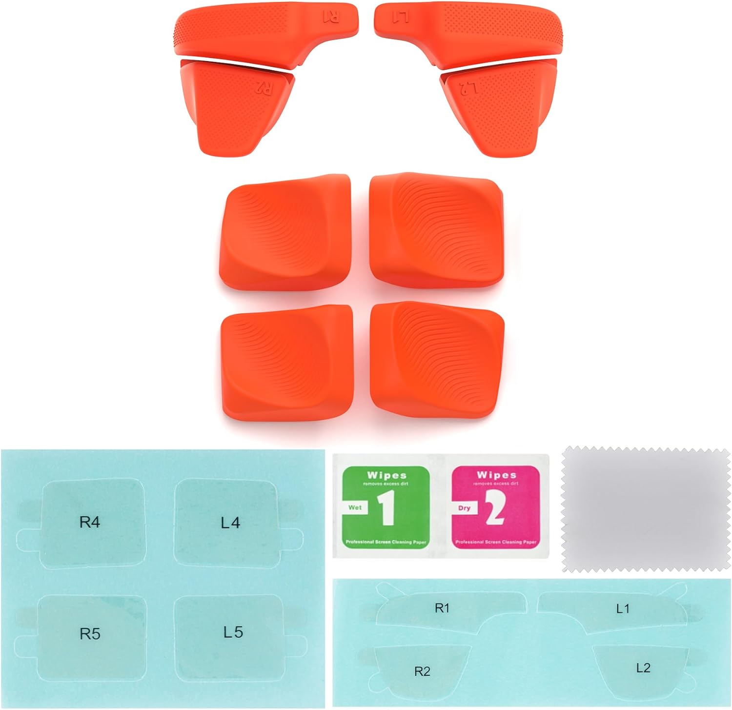 A embalagem inclui um conjunto de melhoria de gatilhos (L1, R1, L2, R2), 4 botões traseiros de substituição e os adesivos necessários para a aplicação de ambos. O pacote conta ainda com guias de usuário detalhados para orientar a instalação correta de todos os componentes.