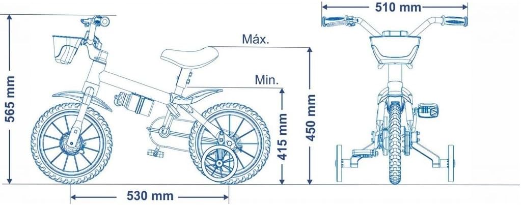 Construída em aço carbono de alta resistência, a bicicleta possui tamanho aro 12 polegadas e peso total de 3,98 kg. Suas dimensões são 53 x 51 x 56,5 cm, apresentando um modelo de suspensão rígida e freios tipo tambor, garantindo frenagens seguras e eficientes para iniciantes.