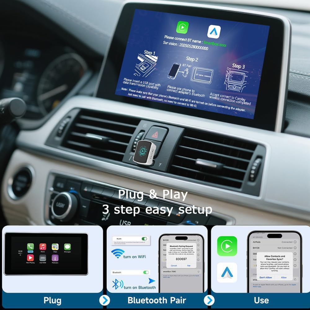 Ele funciona com alimentação de 5 Volts através de conexão com fio ao painel, não exigindo o uso de baterias. O adaptador é compatível com iPhone (iOS 10+) e Android (11+), sendo indispensável que o veículo já possua o sistema CarPlay ou Android Auto integrado originalmente de fábrica.