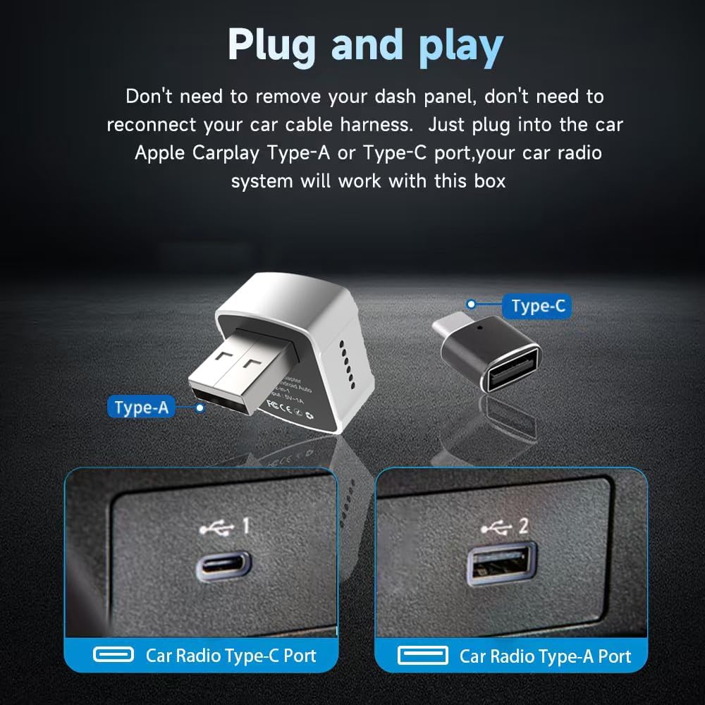 Para o funcionamento correto do adaptador, é obrigatório que o sistema do veículo já tenha o CarPlay ou Android Auto de fábrica. O pacote acompanha adaptadores para garantir a conectividade com entradas USB-A e USB-C.